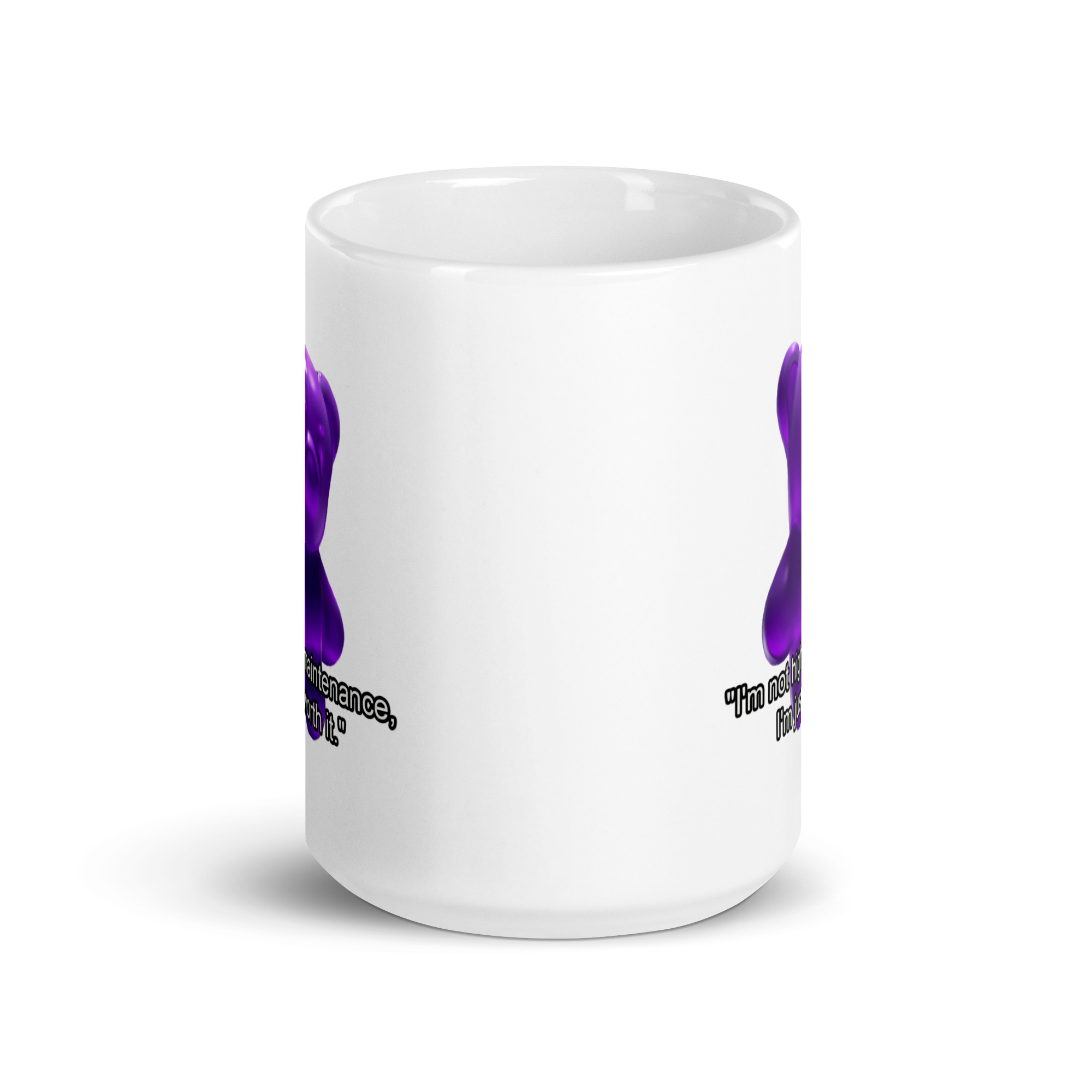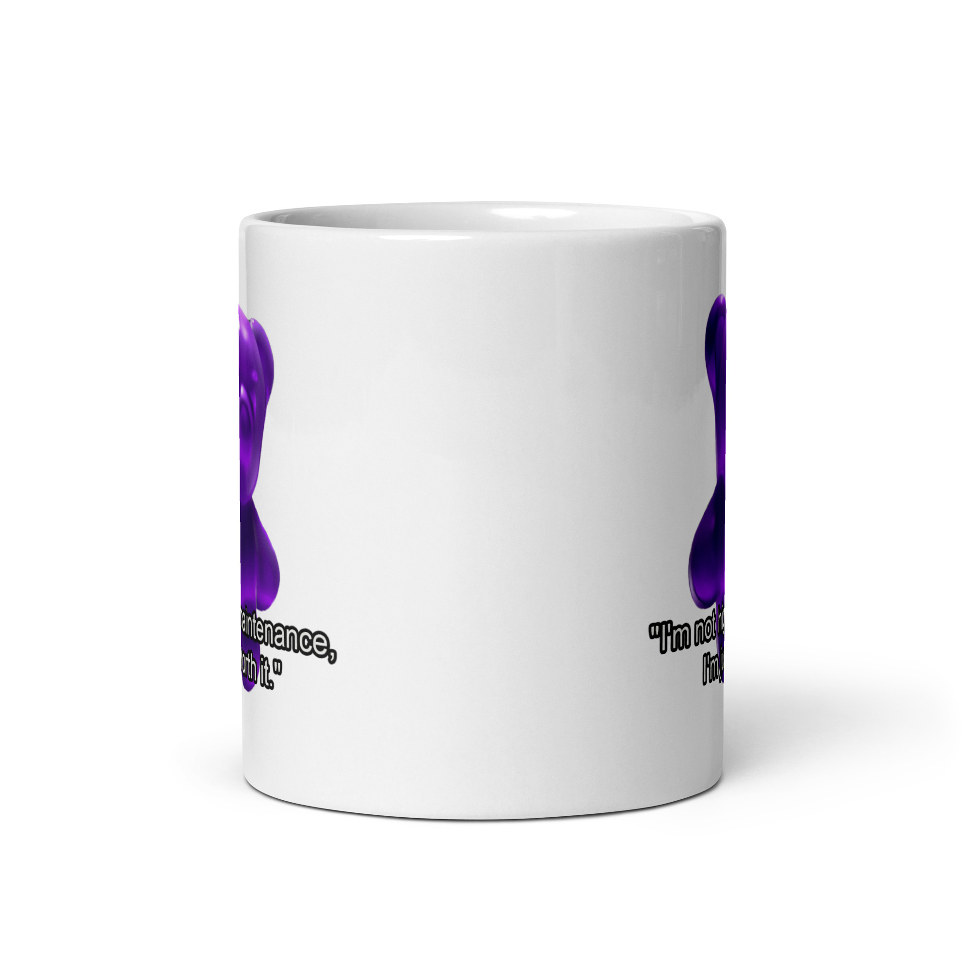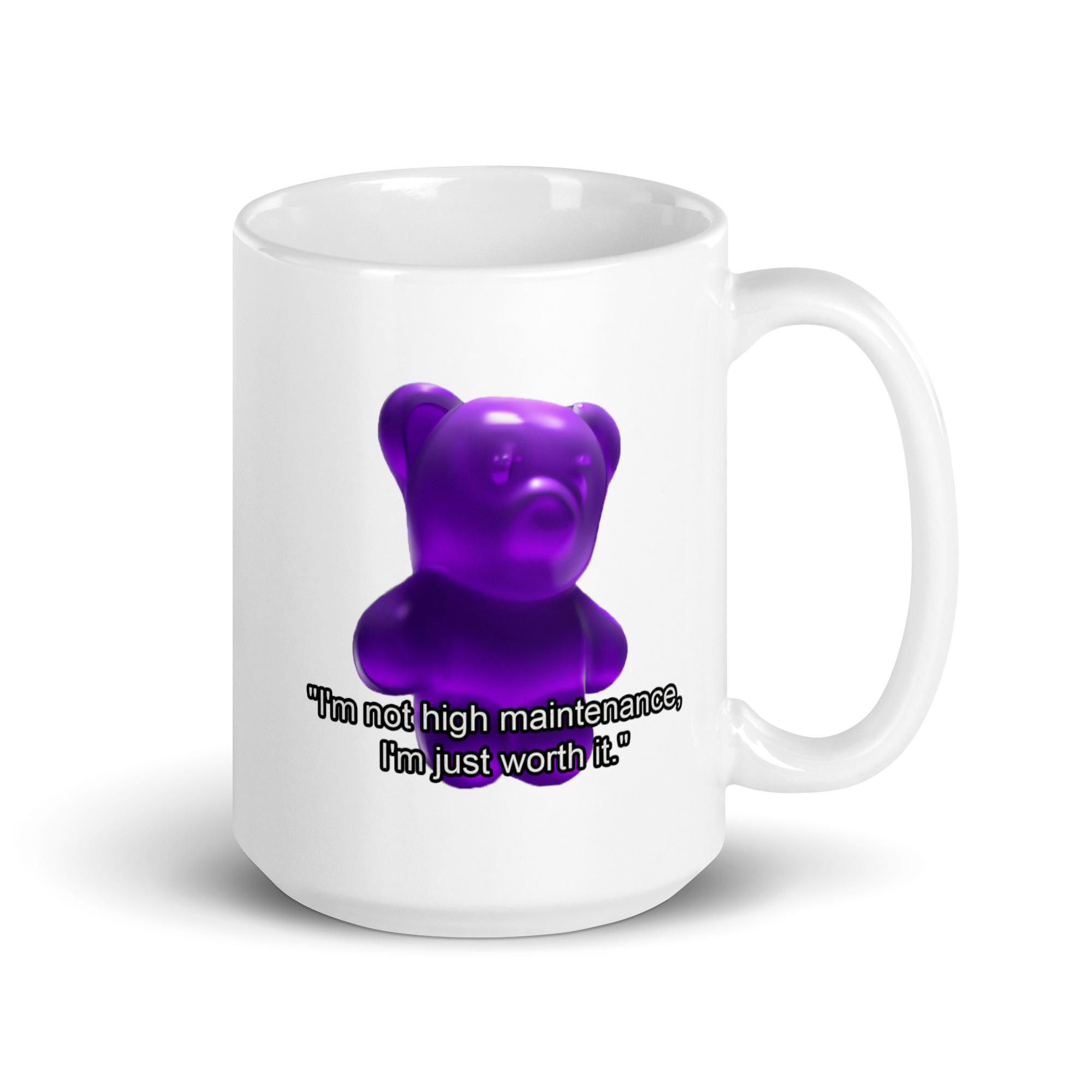 White glossy mug purple gummy bear “I’m not high maintenance, I’m worth it.”